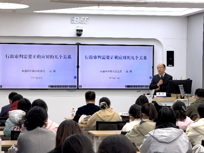 11月27 日,人文与社会科学学院院在人文院楼 213 教室举办第二十二期人文大师课,活动邀请全国审判业务专家、南通市中级人民法院副院长高鸿围绕《行政审判应当正确应对的几个关系》开展专题讲座。活动由院长高志宏主持。