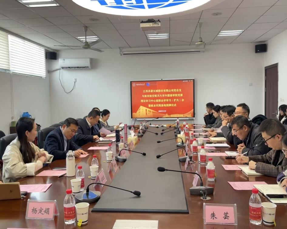 12月12日上午,外国语学院党委与江苏苏豪长城股份有限公司党总支在将军路校区外国语学院322会议室联合举办理论学习中心组联合学习(扩大)会暨就业实践基地授牌仪式。