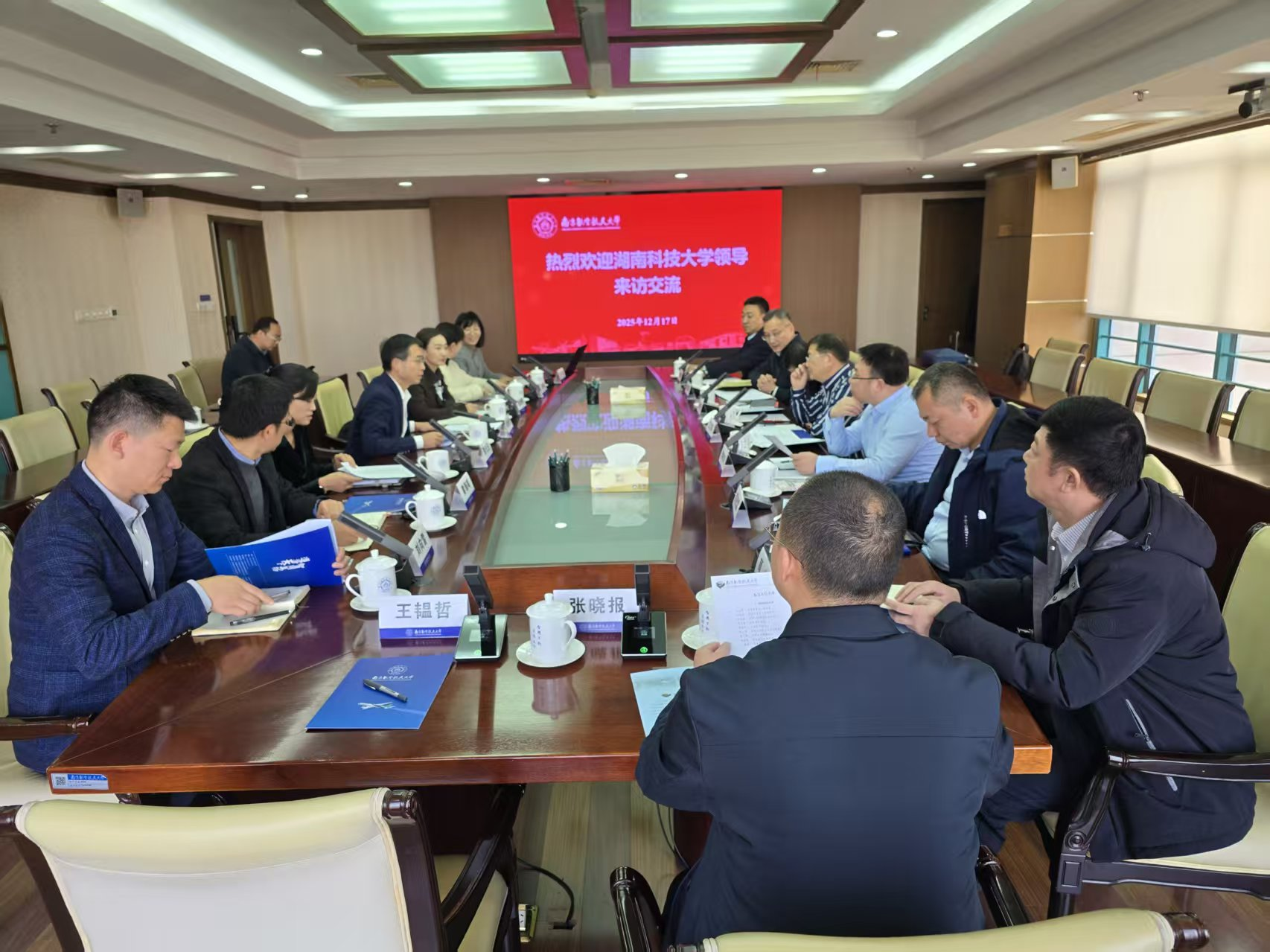 12月17日,湖南科技大学党委委员、副校长王卫军,党委委员、纪委书记郭时印带队来校调研,重点围绕“十五五”规划编制、学科建设及政治监督、纪检监察、师资引育、人才培养、科学研究等工作开展交流研讨。我校党委副书记、纪委书记杭育新出席座谈会。