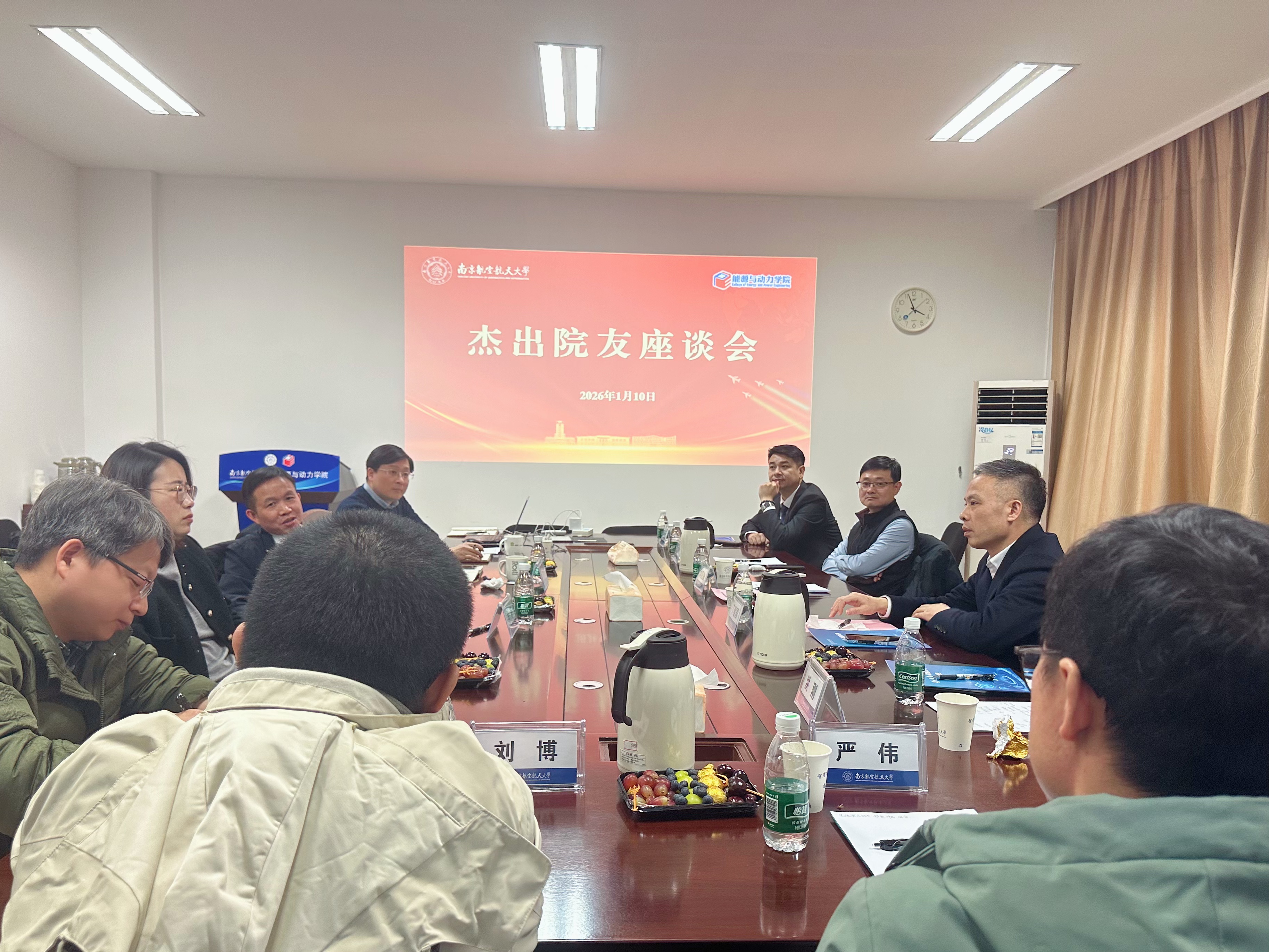 1月10日下午,能源与动力学院在明故宫校区A10-500会议室举办校友座谈会。来自商业航天、航空发动机等领域的八位杰出校友重返学院,与学院党委书记许静、院长谭慧俊、教师和机关办公室代表等齐聚一堂,围绕空天动力事业前沿发展、学科建设与校企协同等话题展开深入交流。会议由党政办公室主任王成军主持。