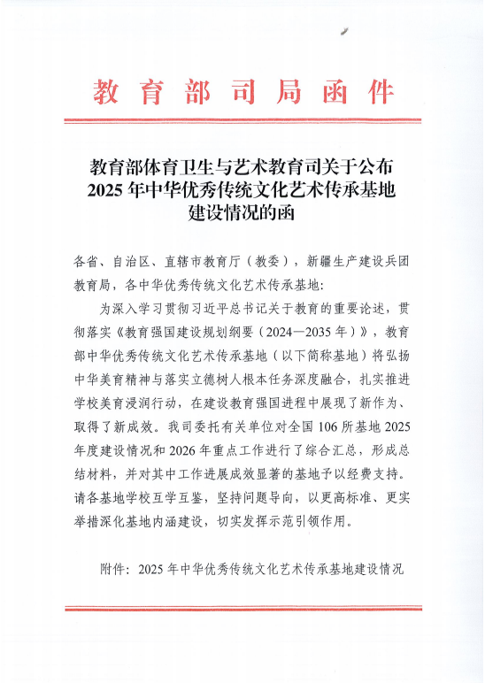 2025年底,教育部体育卫生与艺术教育司公布了全国106所中华优秀传统文化艺术传承基地2025年建设情况,其中选评出33个工作成效显著的传承基地重点培育项目予以支持。我校由艺指委副主任杨莉莉教授牵头申报的“中华优秀传统文化艺术传承基地(剪纸)”凭借扎实的传承基础、创新的育人模式及显著的实践成效获教育部专项经费支持,为学校中华优秀传统文化传承工作再添浓墨重彩的一笔。