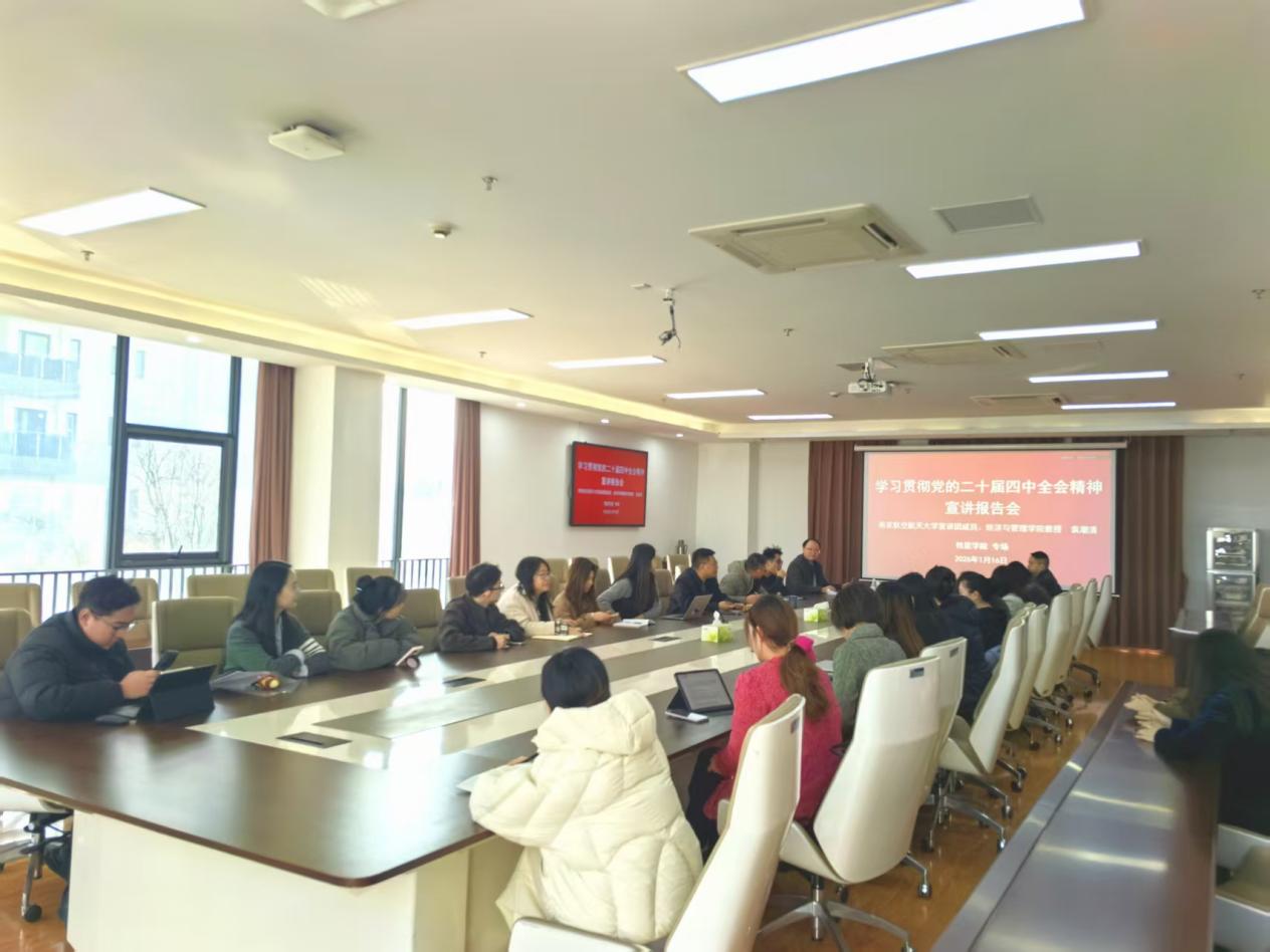 为深入学习贯彻党的二十届四中全会精神,引导全院师生深刻领会、准确把握全会核心要义与战略部署,1月16日,牧星学院举行学习贯彻党的二十届四中全会精神校内宣讲团报告会。本次报告会特邀校内宣讲团成员、经济与管理学院袁潮清教授作专题辅导。学院班子成员、全体党员参加学习,报告会由学院党委书记贡海俊主持。