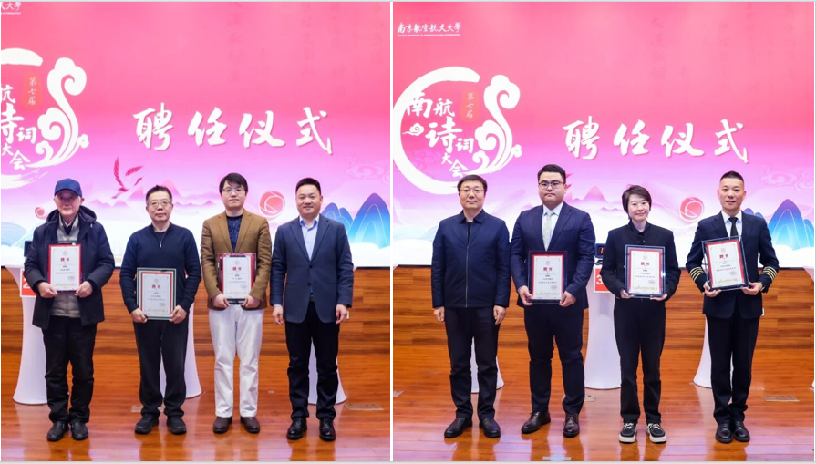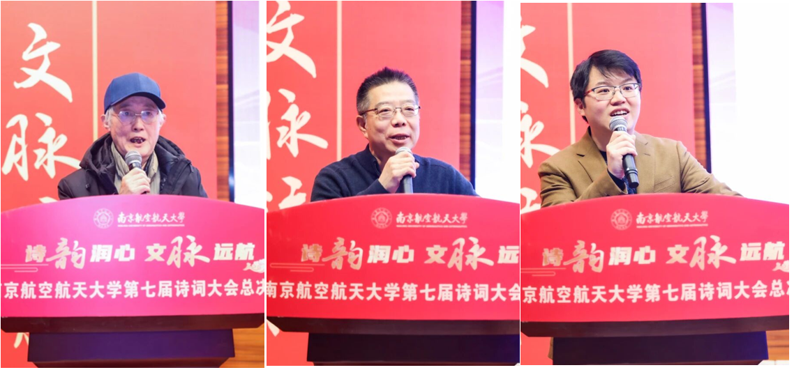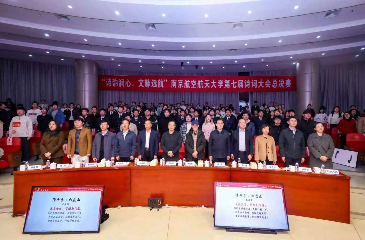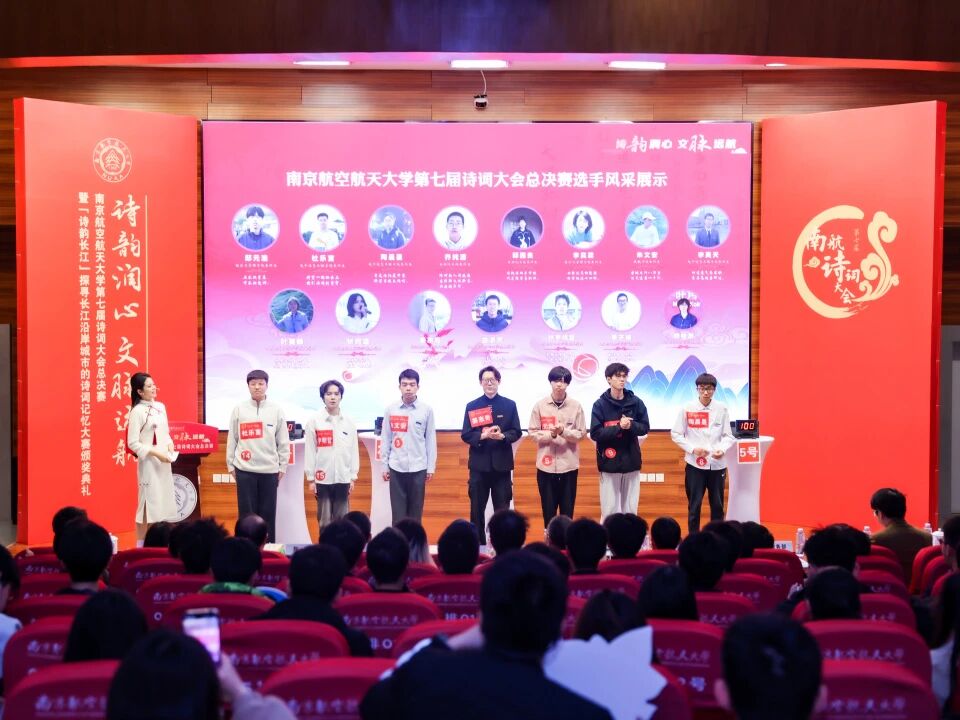 近日,“诗韵润心·文脉远航”南京航空航天大学第七届诗词大会总决赛暨“诗韵长江”探寻长江沿岸城市的诗词记忆大赛颁奖典礼在将军路校区举行。校党委书记甄良,校党委副书记、纪委书记杭育新,校党委副书记陶勇、刘宇雷,清华大学特聘教授、中国韵文学会会长、央视《中国诗词大会》总顾问钟振振,新华社江苏分社原副社长、全球汉诗总会副会长徐战前,南京大学文学院特聘研究员、青年诗人刘驰,2011届校友、2023中国诗词大会总冠军、中国南方航空股份有限公司飞行总队飞行教员马保利,2017届校友、北京航空航天大学博士后、2025中国诗词大会参赛选手孙晓婧,2023届校友、沈阳飞机工业(集团)有限公司工艺员、第四届南航诗词大会榜眼谷建霖出席活动。