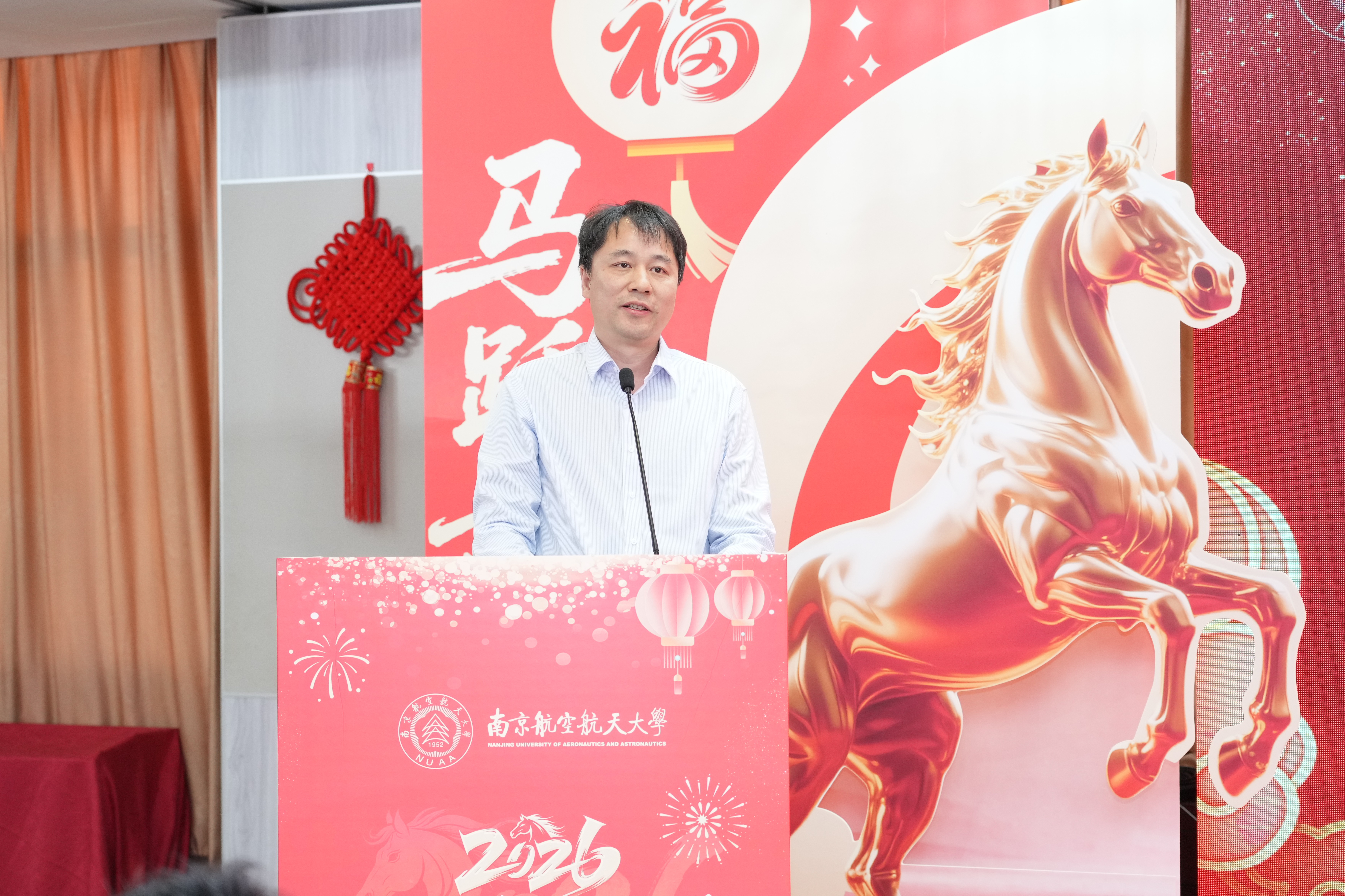 1月23日,我校2026年迎新春茶话会在明故宫校区举行。中国科学院院士朱荻,校级老领导,全体校领导,各级人大代表、政协委员、政府参事,各民主党派、统战团体主要负责人,离退休老同志代表,高层次人才代表,省部级以上项目、成果、团队、平台等负责人代表,2025“感动南航”年度人物及提名奖获得者,各学院、职能部门及直属单位主要负责同志以及学生代表欢聚一堂,畅叙情谊、共迎新春、展望未来。茶话会由校长姜斌主持。