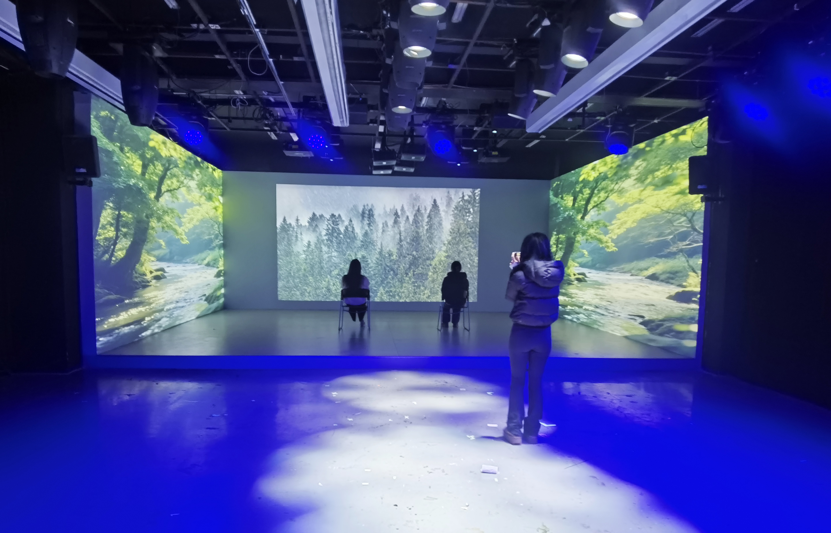 实践环节以“多维度感官协同”为核心,创新区教师团队搭建了多个主题沉浸式光影环境,涵盖视觉仿真、声音疗愈与作品解析等模块。在专业指导下,学生们通过亲身体验“感官协同唤醒”与“情绪深度共鸣”的完整流程,实现了从理论认知到实践感知的深度学习转化,这一过程强化了学生的工程应用能力与艺术表达能力。