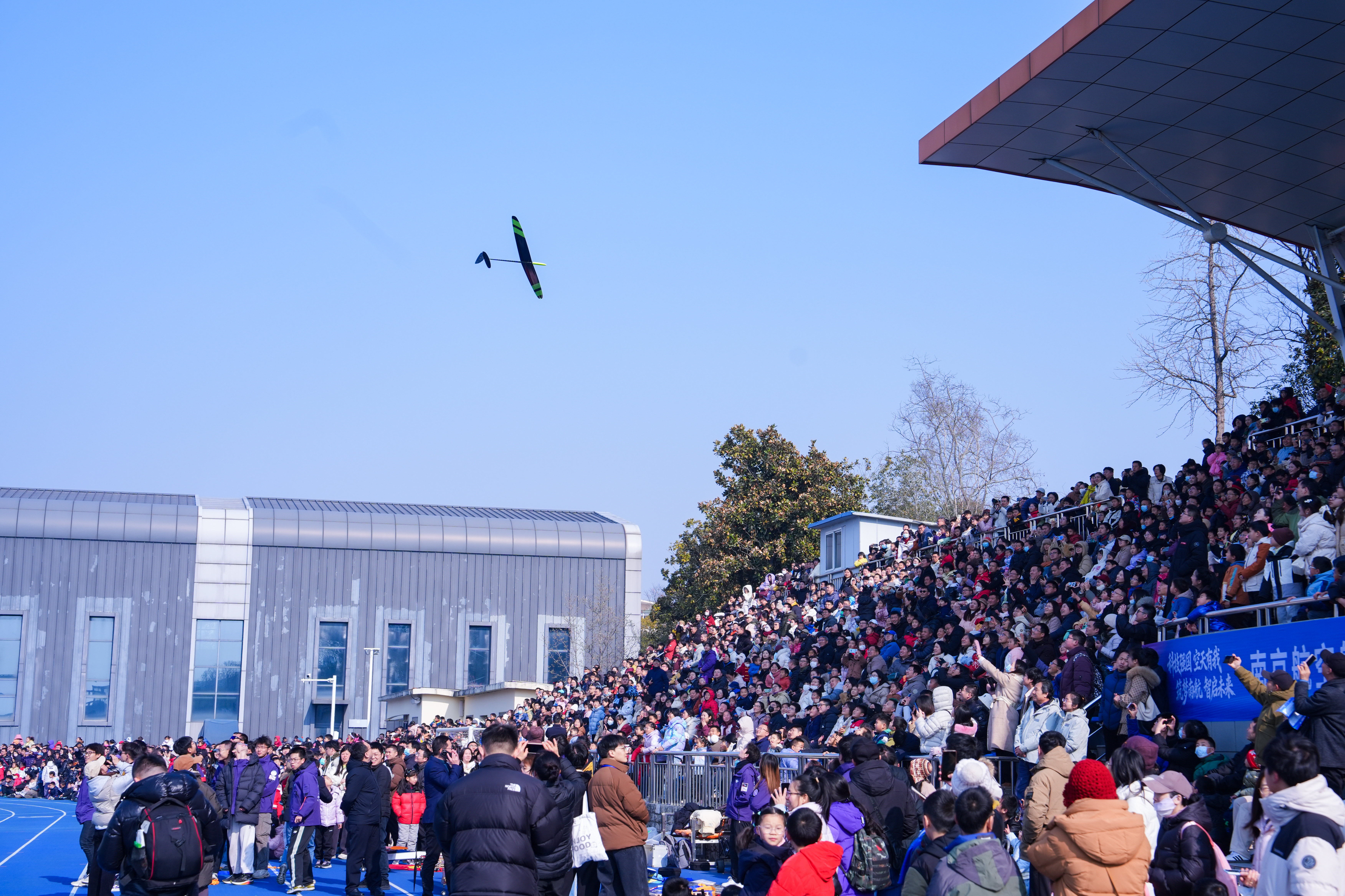 绿茵场上,校科协航模队带来的航模表演成为点燃青少年空天梦想的活动高潮。引擎轰鸣中搭载绚丽彩烟的航模腾空而起,连贯完成翻转、盘旋等系列高难度动作,现场欢呼声交织回荡,氛围热烈。参观青少年深受触动,不少人直言“近距离感受航模飞行的震撼,更坚定了投身航空航天事业的理想”。