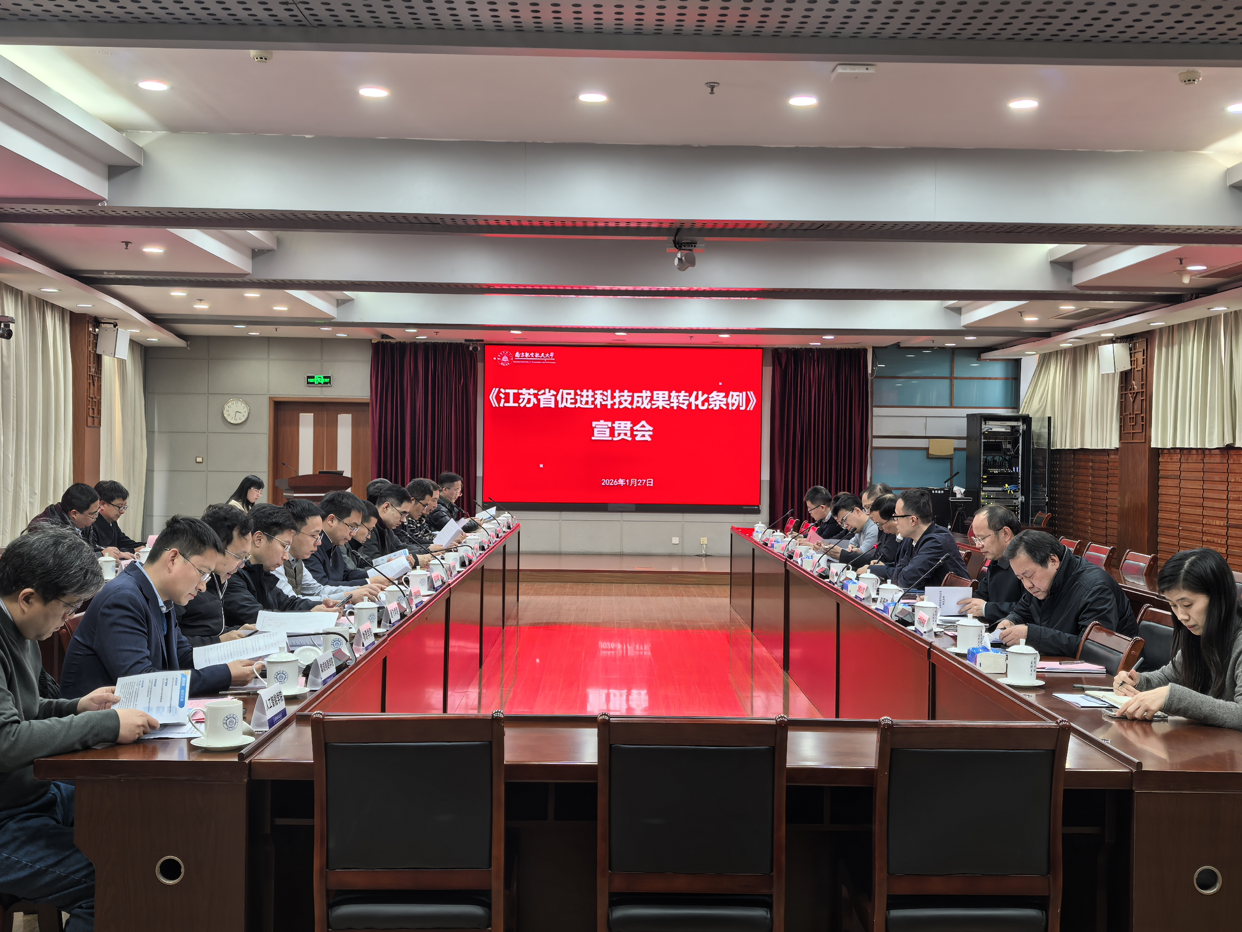 1月27日,我校在明故宫校区召开《江苏省促进科技成果转化条例》(以下简称《条例》)宣贯会,传达学习《条例》精神。校长姜斌,副校长徐正扬、张启钱出席会议。会议由徐正扬主持。