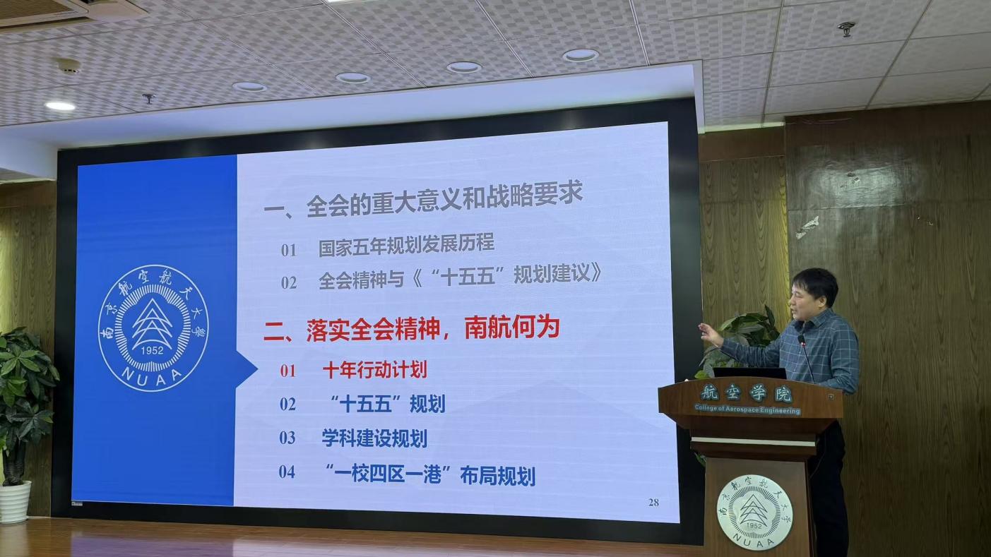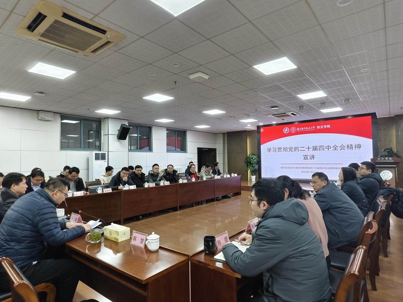 为深入学习贯彻党的二十届四中全会精神,切实以党的创新理论为学院发展导航定向,1月26日,航空学院举行学习贯彻党的二十届四中全会精神校内宣讲团报告会。本次报告会特邀校内宣讲团成员、学校发展规划与学科建设处处长田威作专题辅导。学院领导班子成员、系所长、教师党支部书记、机关全体工作人员及学生党员代表参加会议。报告会由学院党委书记卜建主持。