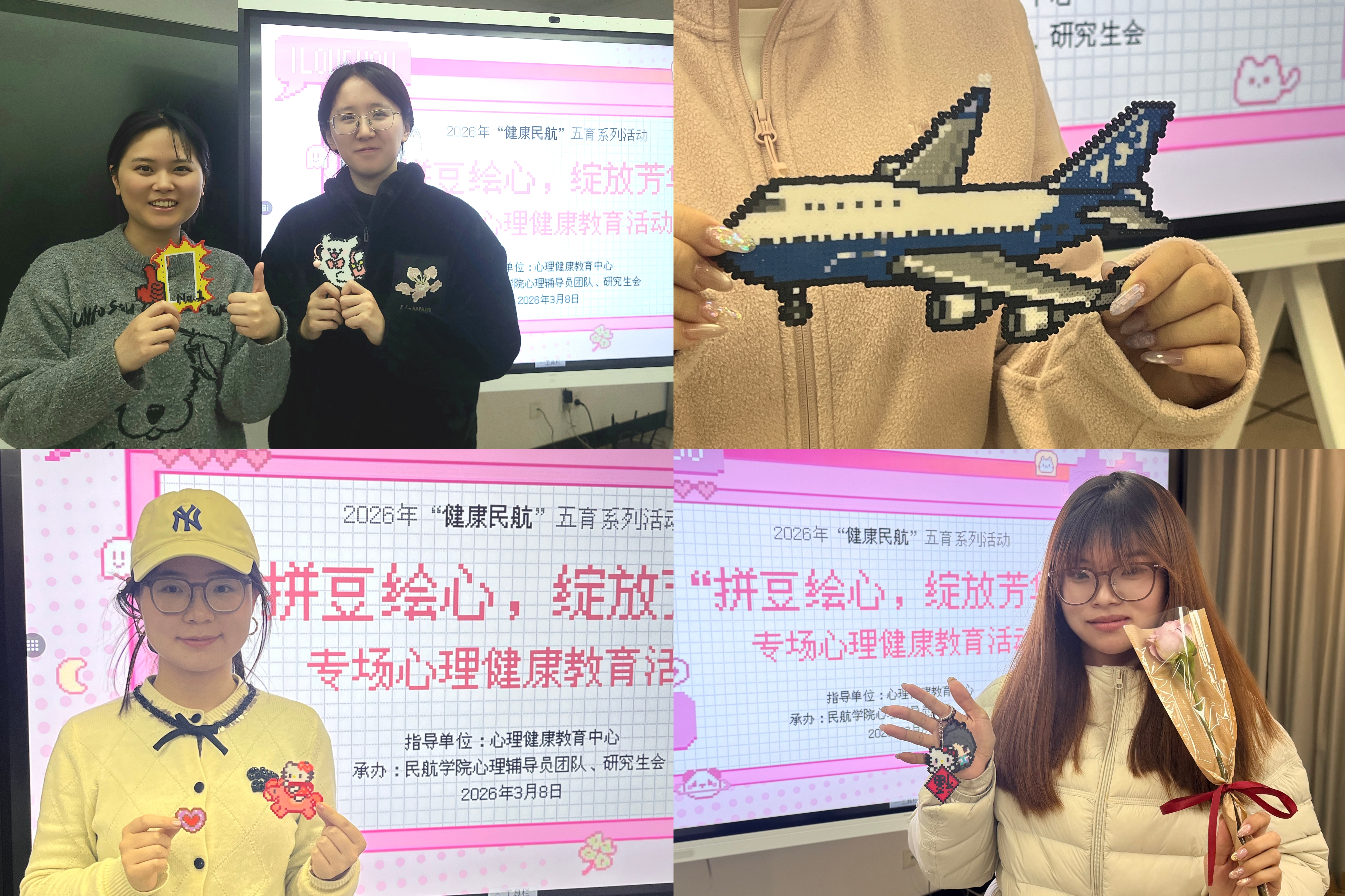 春风送暖,芳华有期。为帮助同学们丰盈精神世界,涵育审美素养,民航学院面向女同学,在2026年三八妇女节当日,采用当下流行的“拼豆”形式,开展了一场主题为“拼豆绘心 绽放芳华”的美学浸润式心理健康教育活动。活动由校心理健康教育中心指导,民航学院主办。