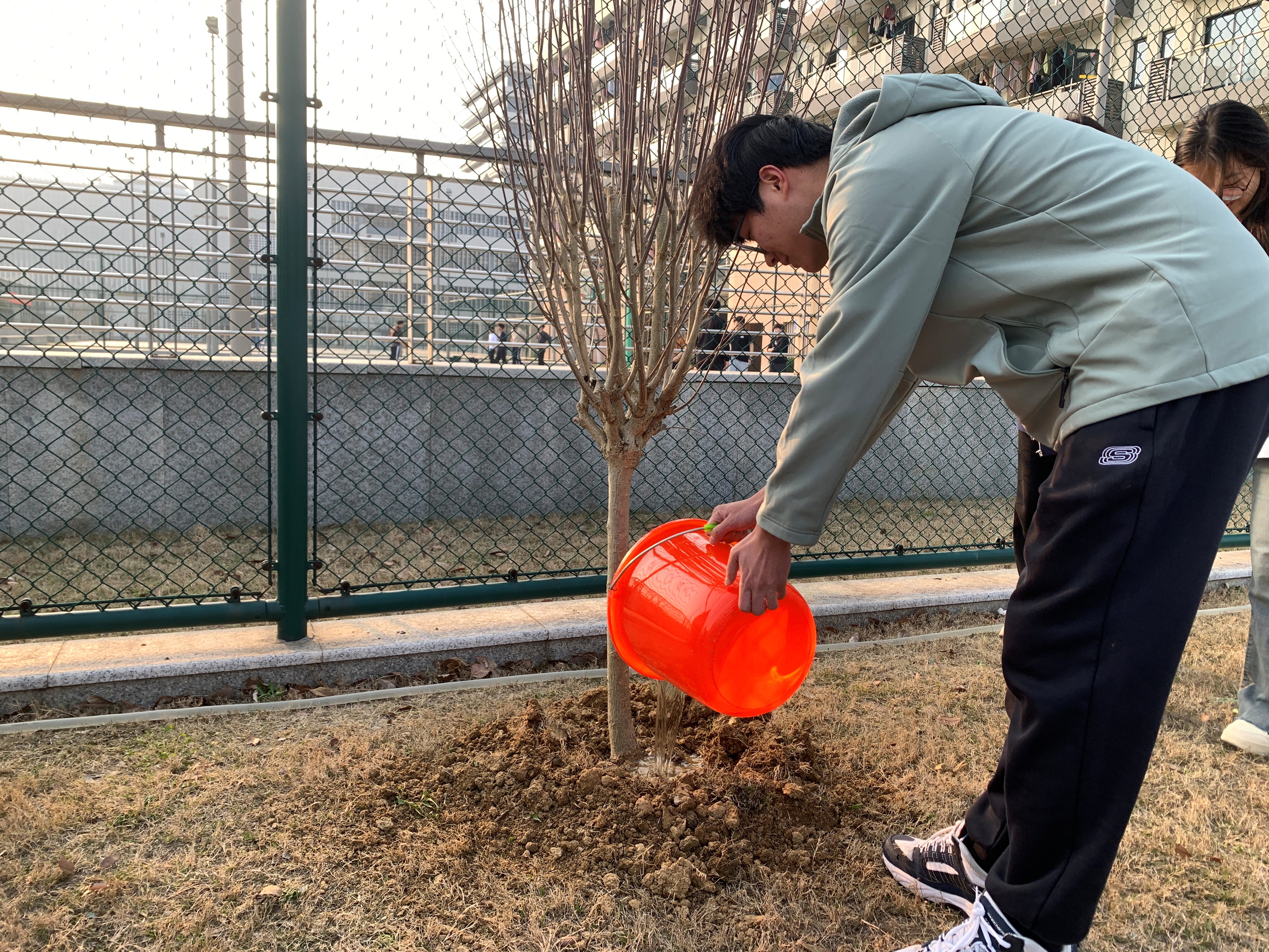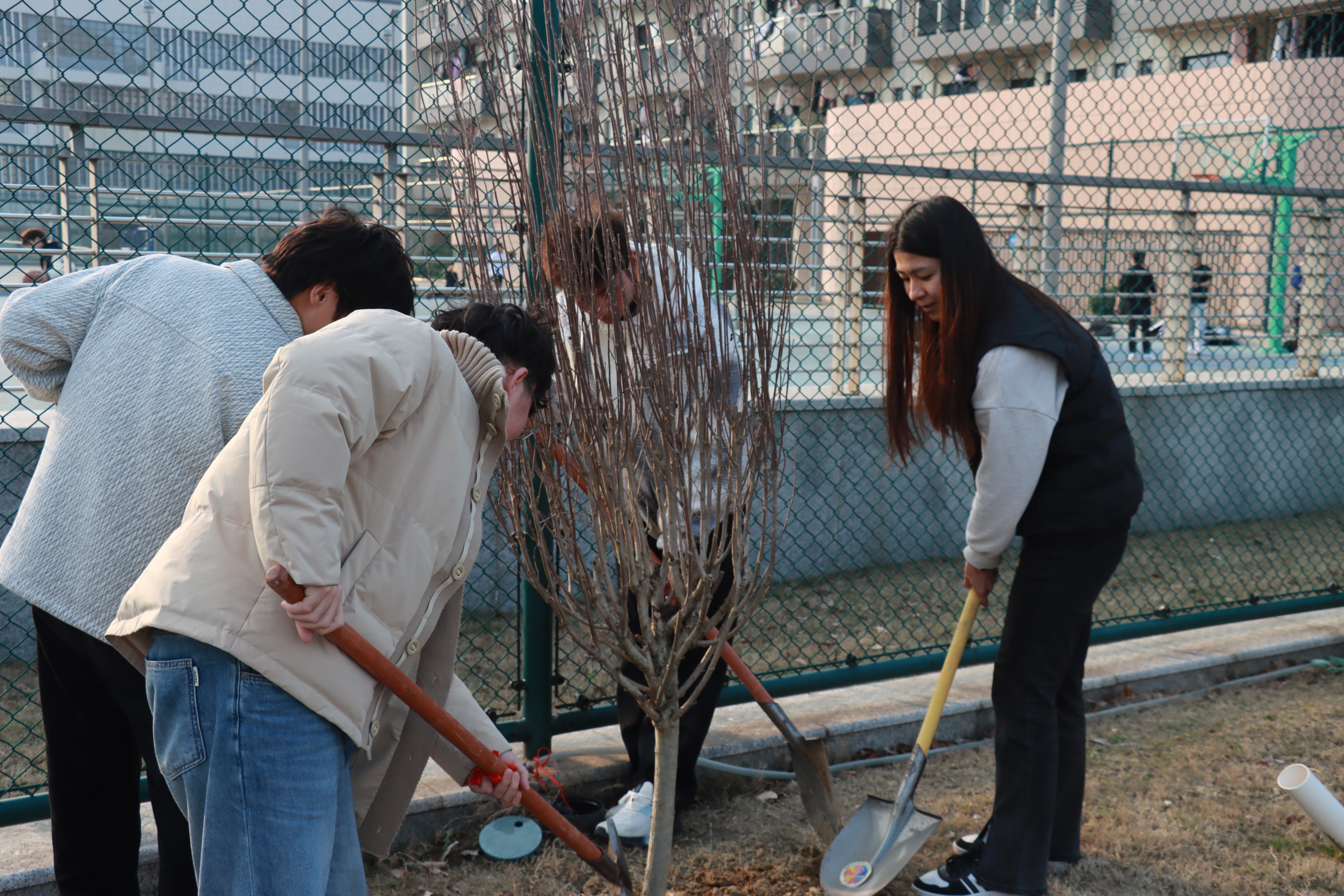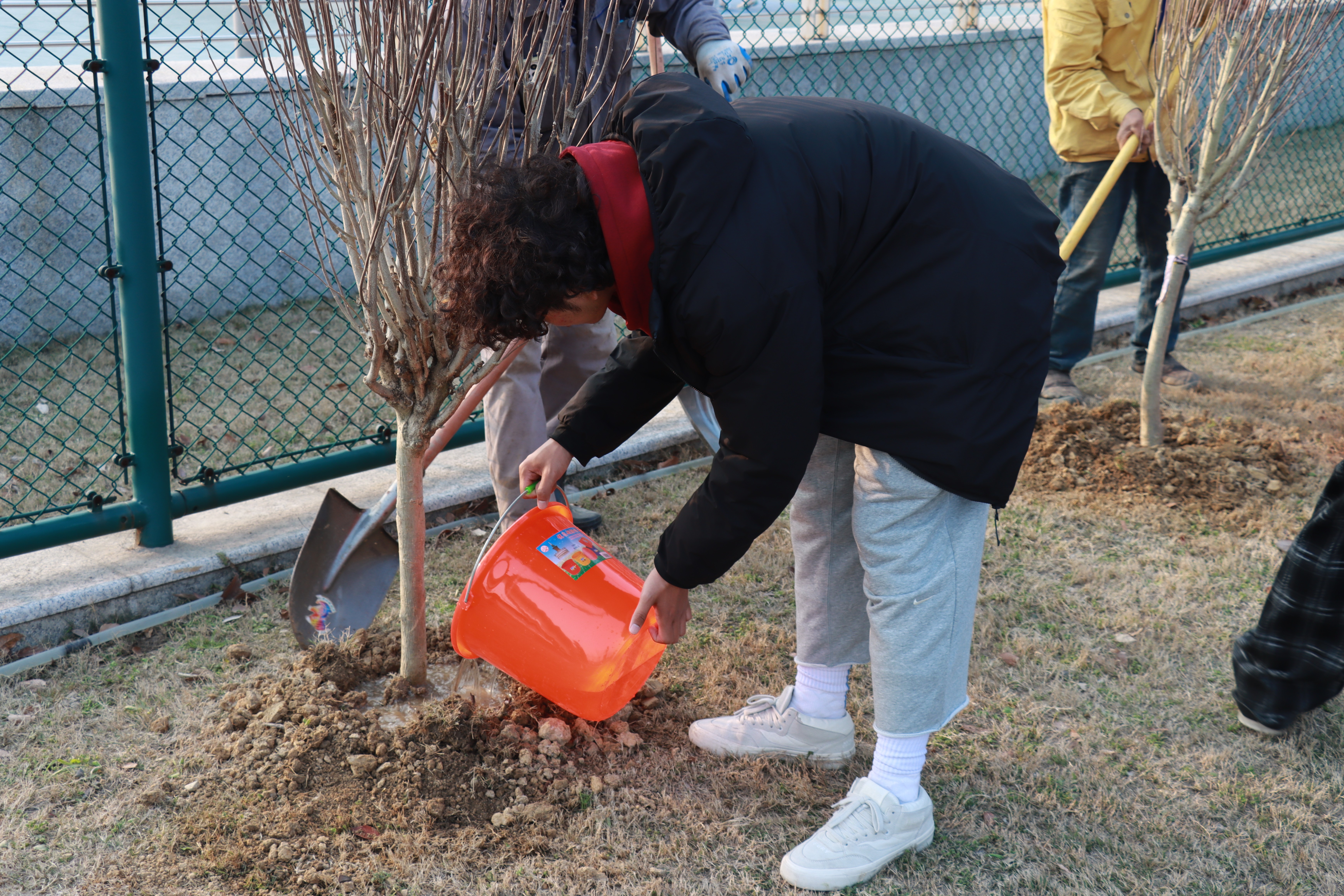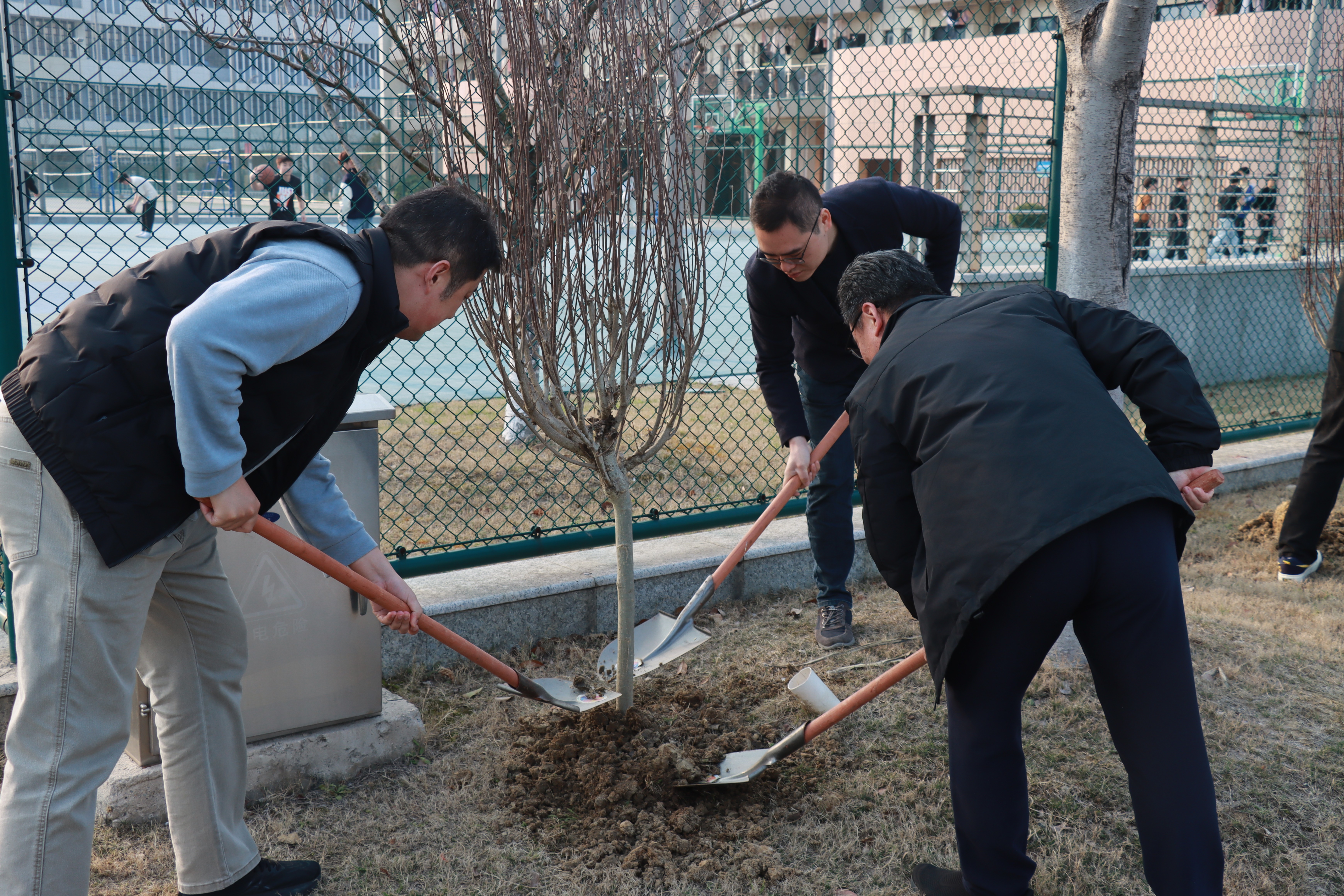 活动现场暖意融融、干劲满满。在工作人员的引导下,两个党支部的党员同志们分工协作、默契配合,有序投入植树劳作。大家挽袖挥锹、扶苗培土、围堰浇水,每一个环节都认真细致、规范有序。现场一派热火朝天的劳动景象,欢声笑语中,一株株新苗迎风挺立,为初春的校园增添了盎然生机与蓬勃活力。