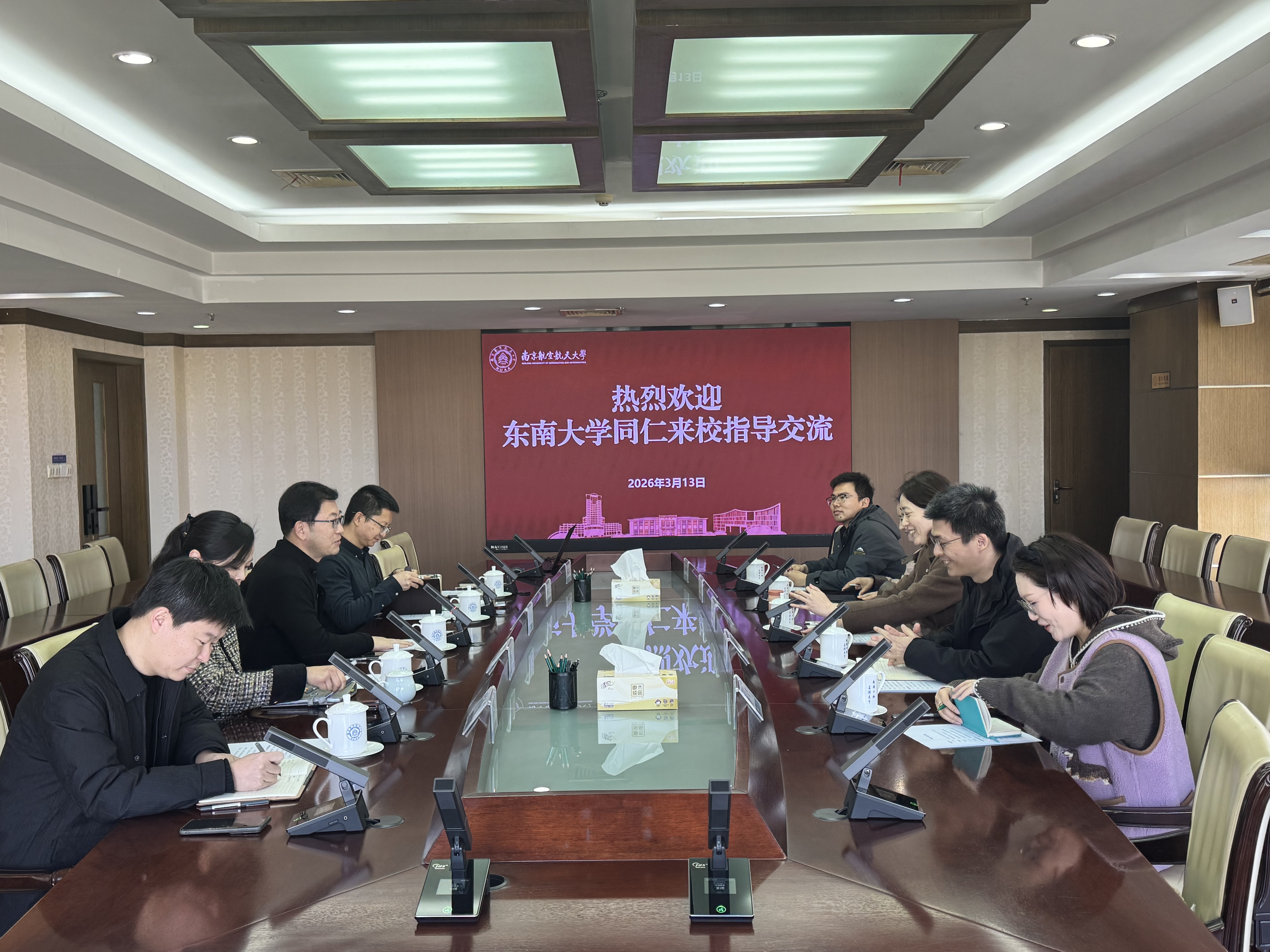 刘静对我校纪检监察工作的系列举措和成效给予了高度评价,她指出,南京航空航天大学在推进“清廉南航”建设、构建信息化监督平台以及打造廉洁文化品牌等方面举措扎实、成效显著,特别是在政治监督的创新实践上具有很强的示范意义,为兄弟院校提供了宝贵经验。随后,刘静介绍了东南大学纪检监察机构的组织架构、工作机制与重点任务,希望双方进一步加强互学互鉴,共同提升纪检监察工作质效。