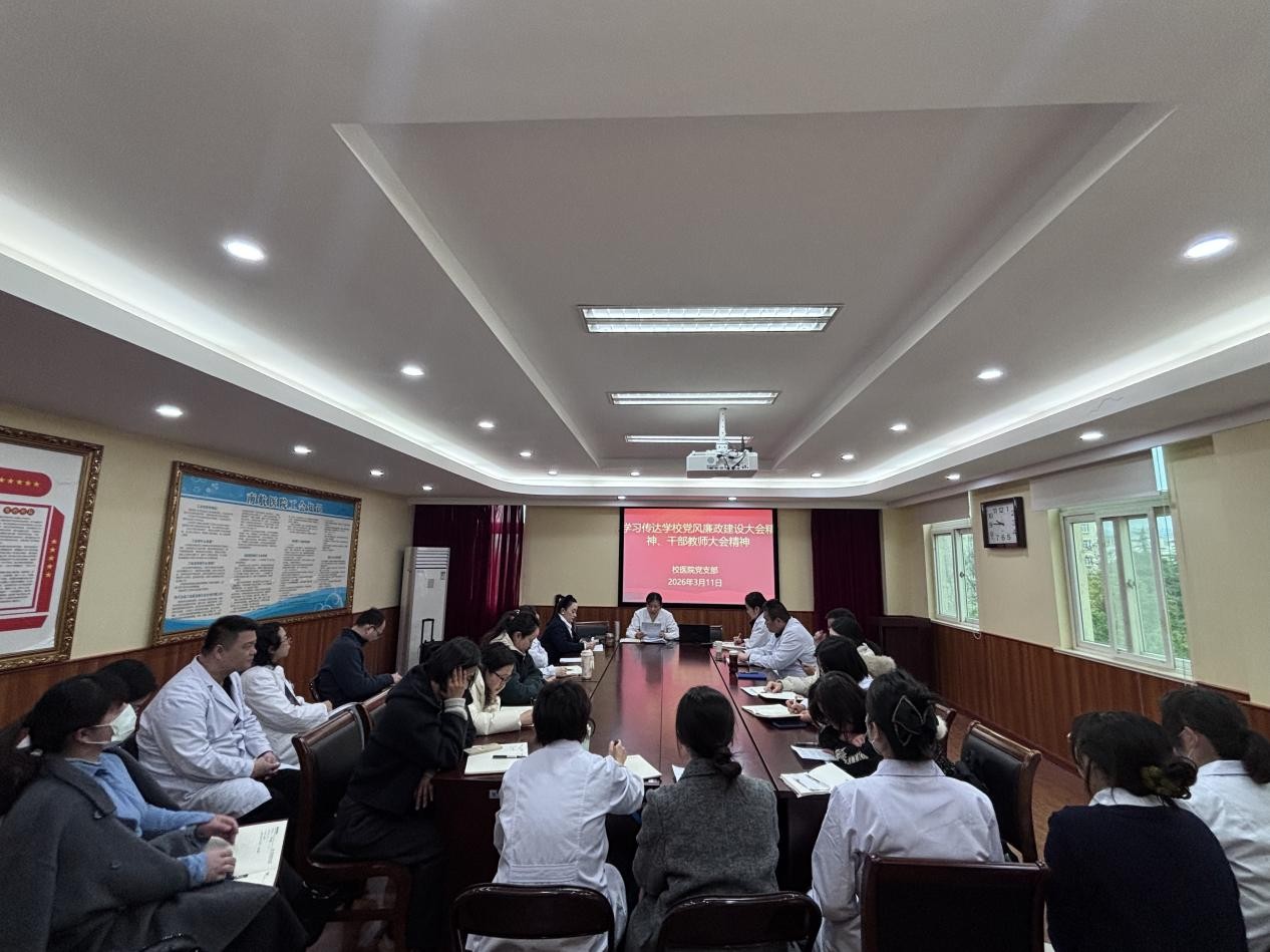为深入贯彻全面从严治党要求,扎实推进清廉医院建设,切实把学校2026年党的建设暨党风廉政建设会议、干部教师大会精神落到实处,3月11日下午,校医院召开专题学习传达会,全体党员、中层干部参会,会议由院长、支部书记陆晖主持。