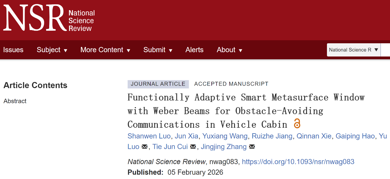 近日,我校电子信息工程学院罗宇教授团队联合东南大学崔铁军院士、张婧婧教授团队在智能透明超表面与车载无线通信领域取得重要研究突破,相关研究成果以“Functionally Adaptive Smart Metasurface Window with Weber Beams for Obstacle-Avoiding Communications in Vehicle Cabin”为题,发表于权威综合性学术期刊《国家科学评论》(National Science Review,影响因子17.1),成功实现利用透明挡风玻璃生成具有自弯曲和自愈合能力的韦伯波束,使无线信号能在复杂的环境(如车厢、巷道等)中绕过各种障碍物,实现稳健的链路传输,为下一代智能网联高速无线通信提供了可靠的方案。罗宇教授、崔铁军院士和张婧婧教授为论文的通讯作者。