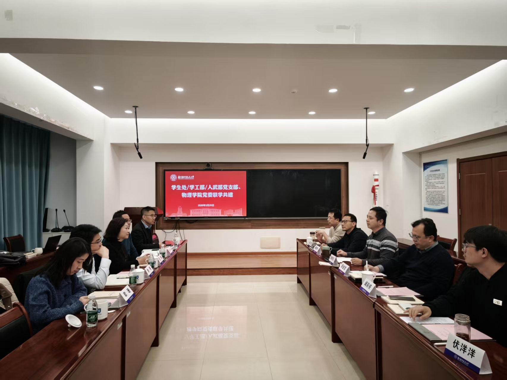 3月20日,物理学院党委与学生处/学工部/人武部党支部开展联学共建活动,本次联学以“以正确政绩观落实两会精神,共担立德树人使命”为主题,双方全体班子成员参加,会议由物理学院党委书记陈修文主持。