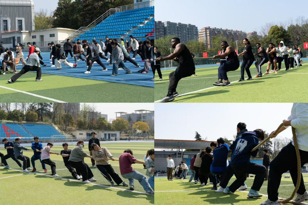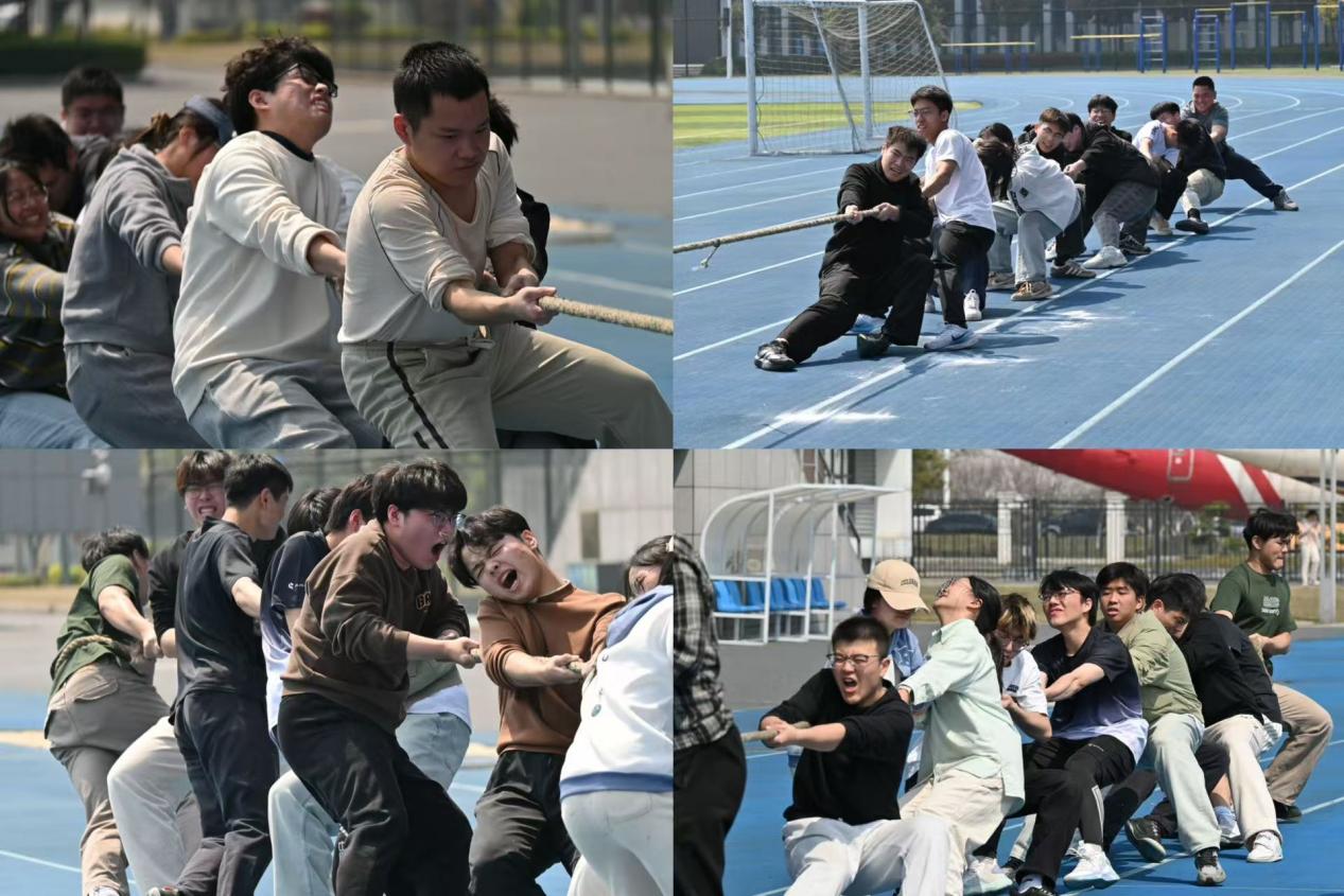 赛哨一响,全员聚力。各队伍紧握绳索、重心后压、协同发力,绳间标记在拉锯中来回移动。整齐划一的呐喊声与此起彼伏的助威声交织回荡,生动展现出南航学子团结拼搏、昂扬向上的精神风貌。