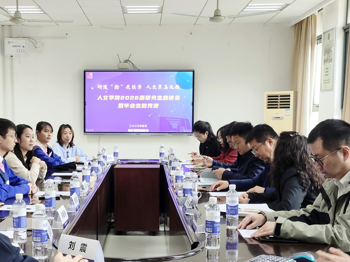 4月1日,人文学院“研途‘拾’光续章,人文策马远航”2026届研究生座谈会暨毕业生微党课顺利举行。院党委书记楚广兴、院长高志宏、院党委副书记李丽、副院长武小龙、研究生导师代表、辅导员及优秀毕业生代表参加活动。