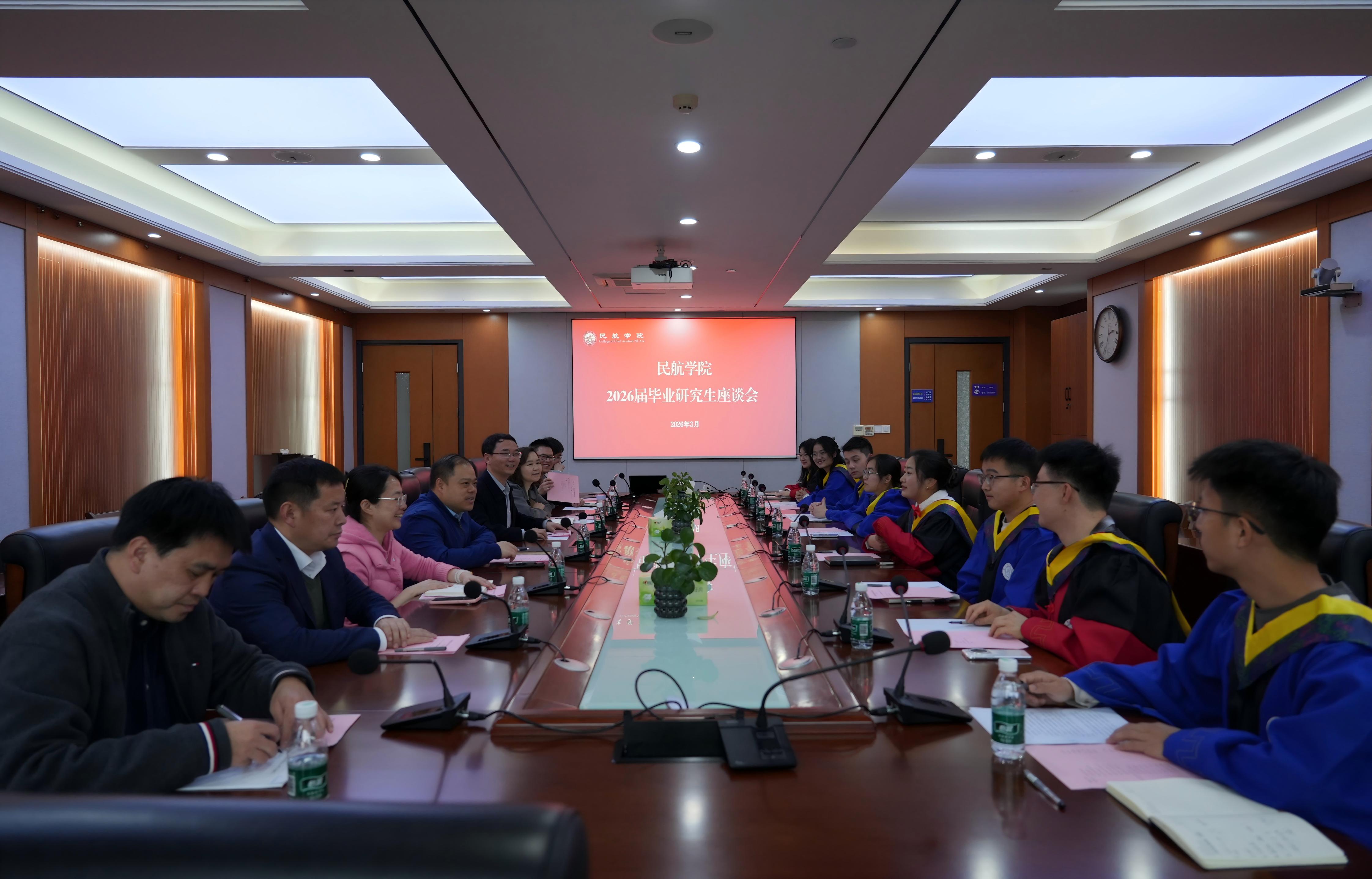 3月30日,民航学院召开2026届毕业研究生座谈会。院长张卓然、党委副书记唐志文、副院长吴薇薇、各系相关负责同志、导师代表、研究生辅导员以及硕博毕业生代表参加座谈。