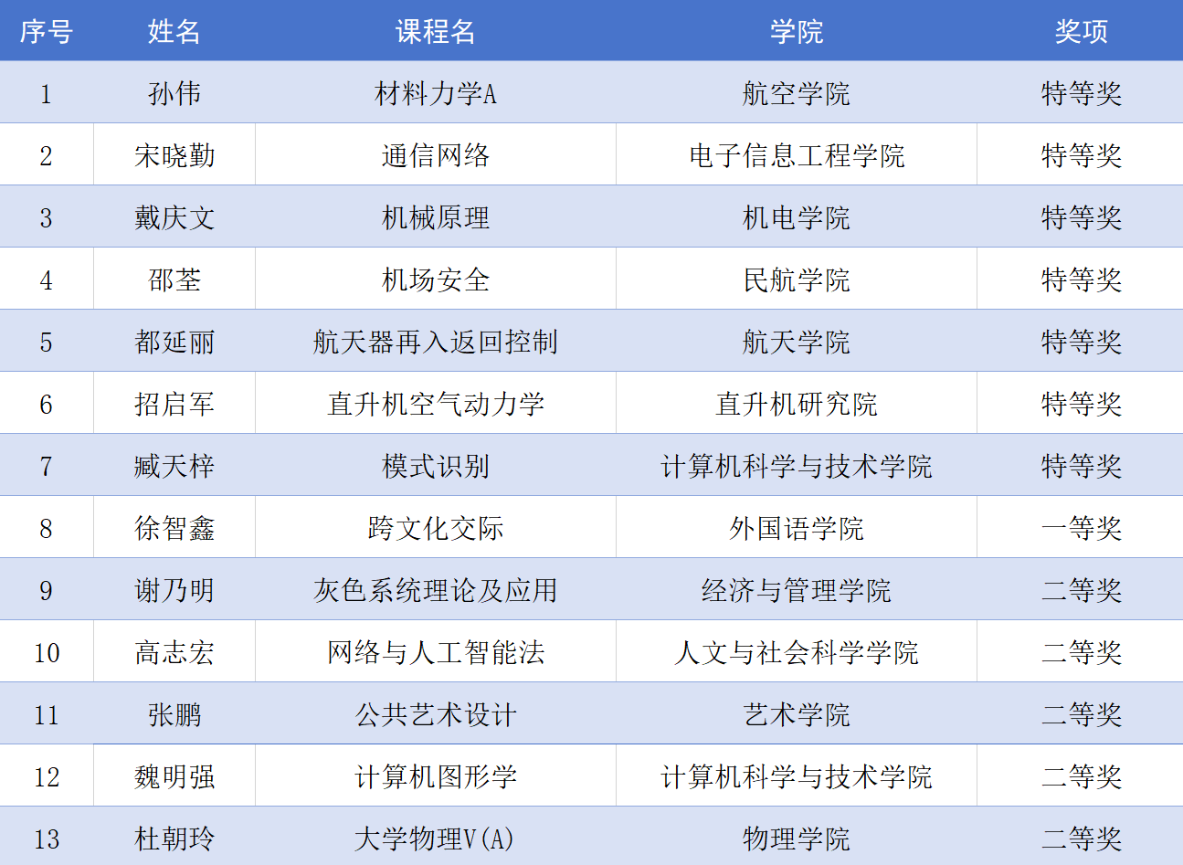 近日,第六届江苏省高校教师教学创新大赛获奖名单公布,我校斩获13项省级奖项,其中航空学院孙伟、电子信息工程学院宋晓勤、机电学院戴庆文、民航学院邵荃、航天学院都延丽、直升机研究院招启军、计算机学院臧天梓等7位教师荣获特等奖,外国语学院徐智鑫荣获一等奖,经济与管理学院谢乃明等5位教师荣获二等奖。我校在本届省赛中特等奖总数、获奖总成绩均为全省第一。