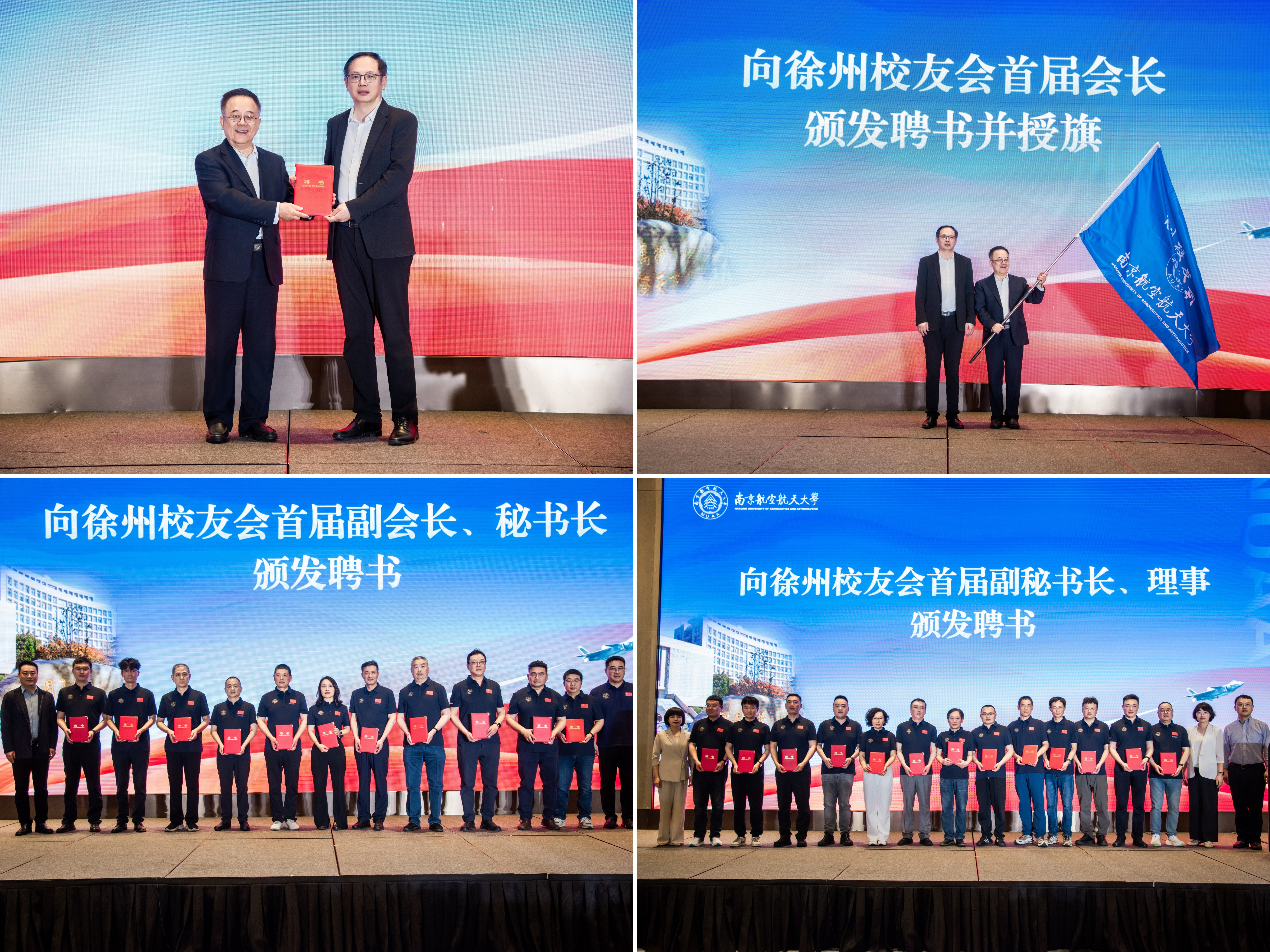 张启钱为首届会长颁发聘书并授予会旗。李和新和天目湖校区党委书记、管委会主任缪长宗为首届副会长、秘书长颁发聘书,发展联络部副部长周佼佼、航空学院副院长师岩、艺术学院党委副书记卢一亭为首届理事、副秘书长颁发聘书。